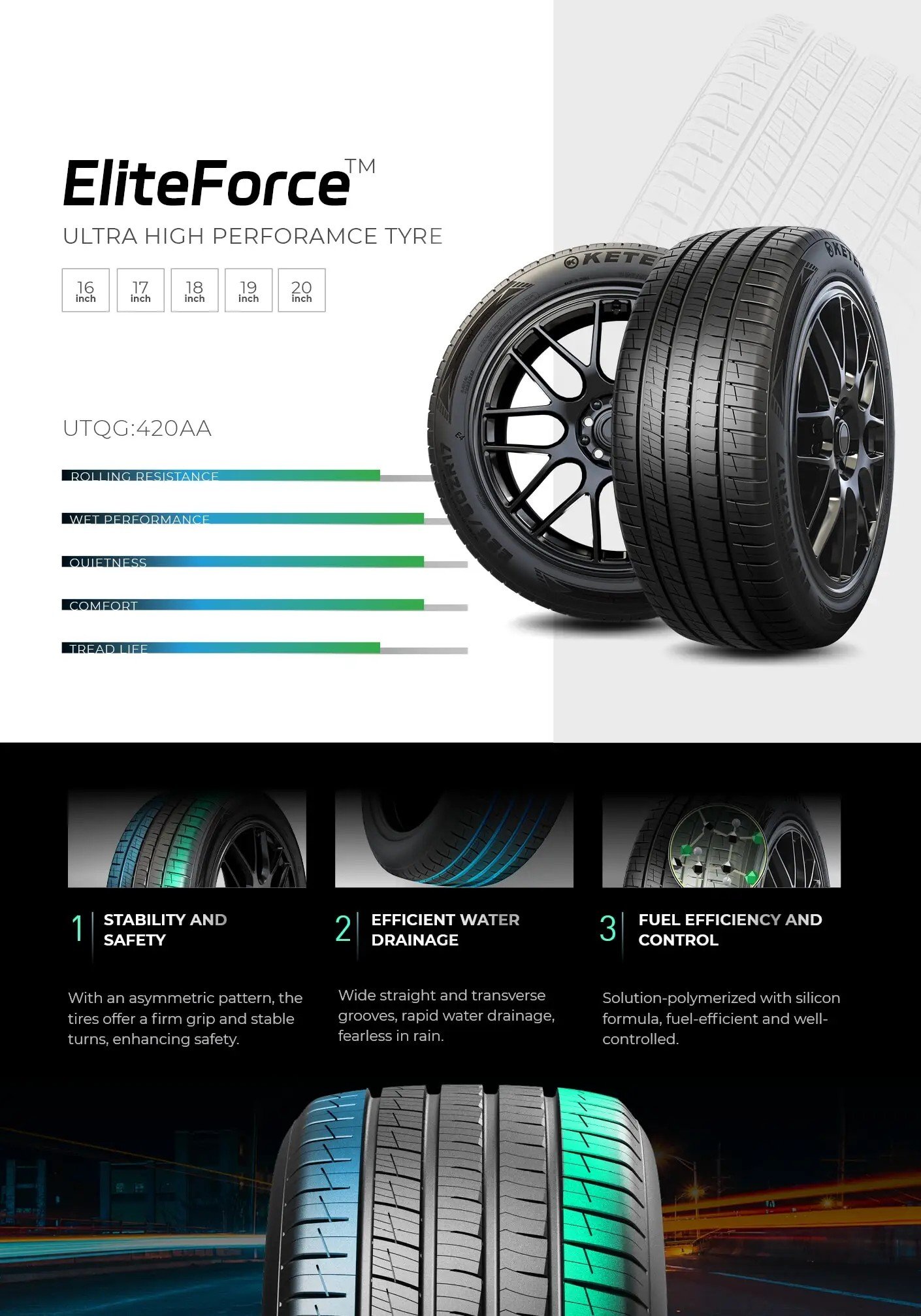 The EliteForce™ tyre ensures stability and safety with its asymmetric pattern. It features efficient water drainage through wide grooves, enhancing wet performance. The silicon formula provides fuel efficiency and control. Available in 16-20 inches, it offers superior comfort and tread life.